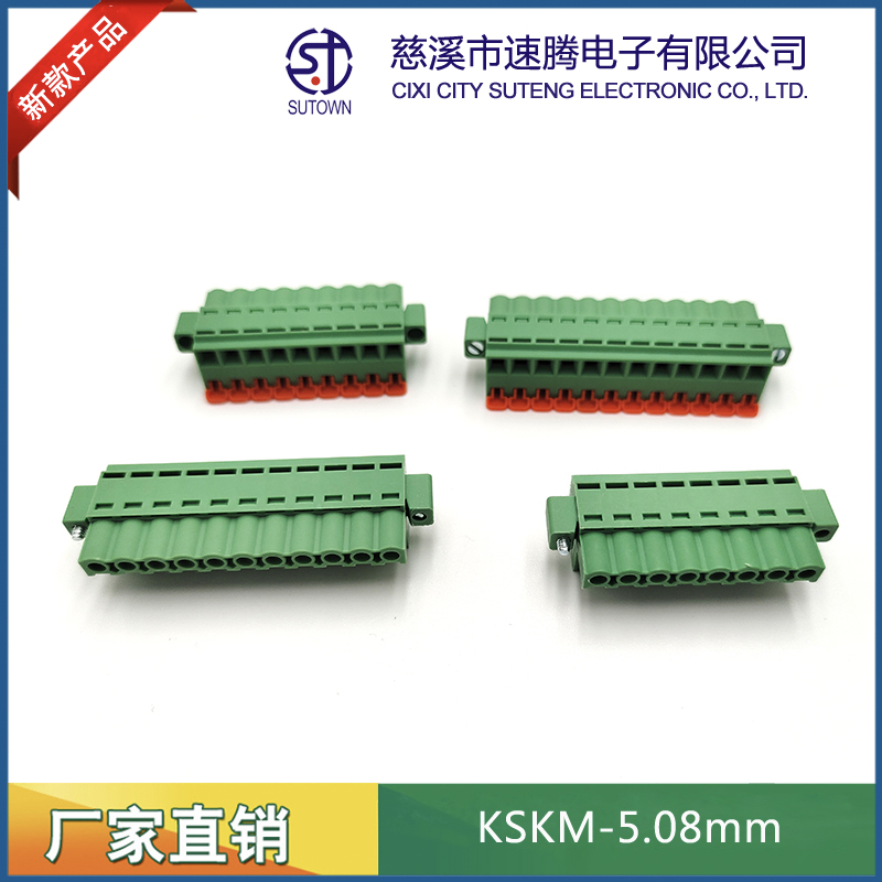 型號:KSKM間距:5.08mm極數:2-24P電氣性能 額定電壓:300V額定電流:15A使用線徑:24-12WG(2.5mm2)環境溫度:-40℃~+105℃瞬時溫度:+250℃,5s耐電壓:AC4000V/Min接觸電阻:20MΩ絕緣電阻:5000MΩ/1000V扭矩:0.4Nm剝線長度:7-8mm材質和電鍍 塑件:PA66,UL94V-0觸點材料:磷青銅,鍍鎳
